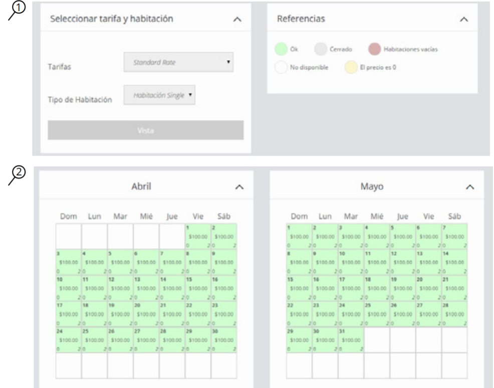La seccion Vista Mensual es una visualización en modo calendario para tener un panorama general de los precios y la disponibilidad de cada habitación en cada plan tarifario. Desde las opciones desplegables, seleccionar la habitación y plan de precios. Las referencias indican qué significa cada color.